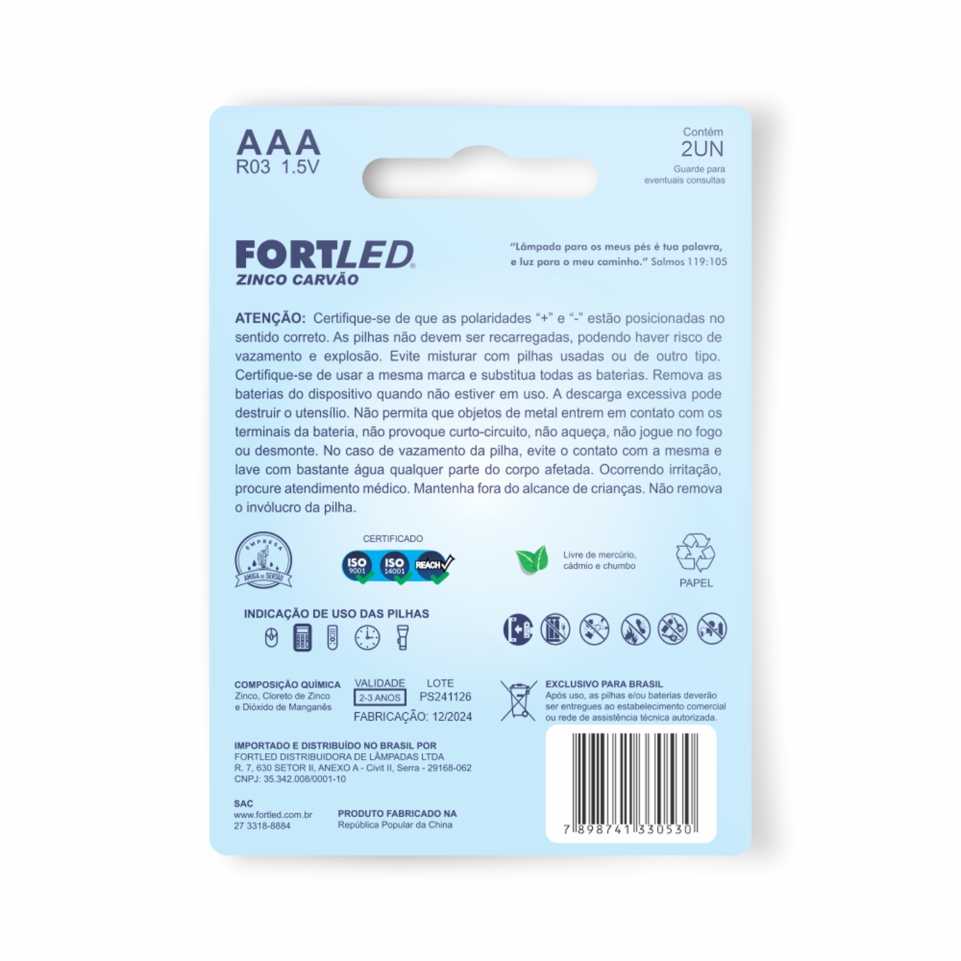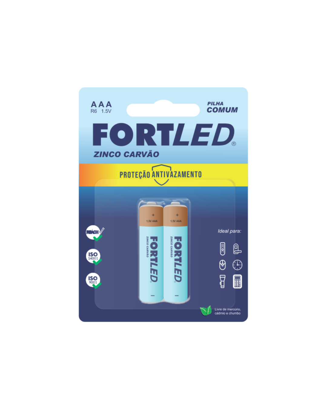 As Pilhas de Zinco Carvão FORTLED foram desenvolvidas para oferecer energia constante e confiável para aparelhos que não exigem alta potência. Livres de mercúrio, cádmio e chumbo, são uma opção mais segura e sustentável, ajudando a proteger tanto seus dispositivos quanto o meio ambiente.